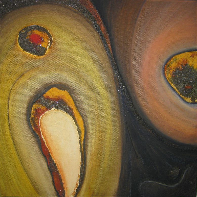Manchmal ergibt sich durch die Auseinandersetzung mit der Fund- und Enstehungsgeschichte des jeweiligen Materials (z.B. schwarzer Lavasand)das Thema des Werkes oder später der Titel(z.B.Im Innern der Erde).