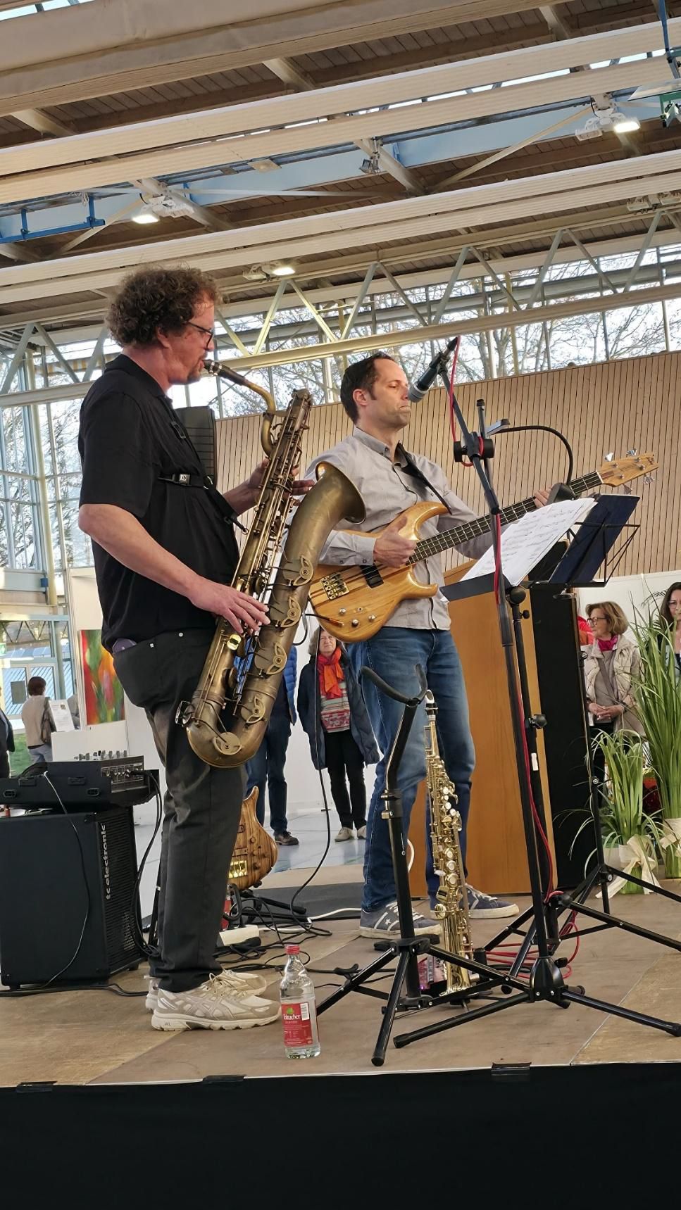 Das Duo Jonas Kuhn (Saxofon) und Stepan Shvarkov (Bass) setzt einen musikalischen Akzent zwischen den Farben und Formen der Kunstwerke und begeistert mit Jazz-und Fusion-Elementen.